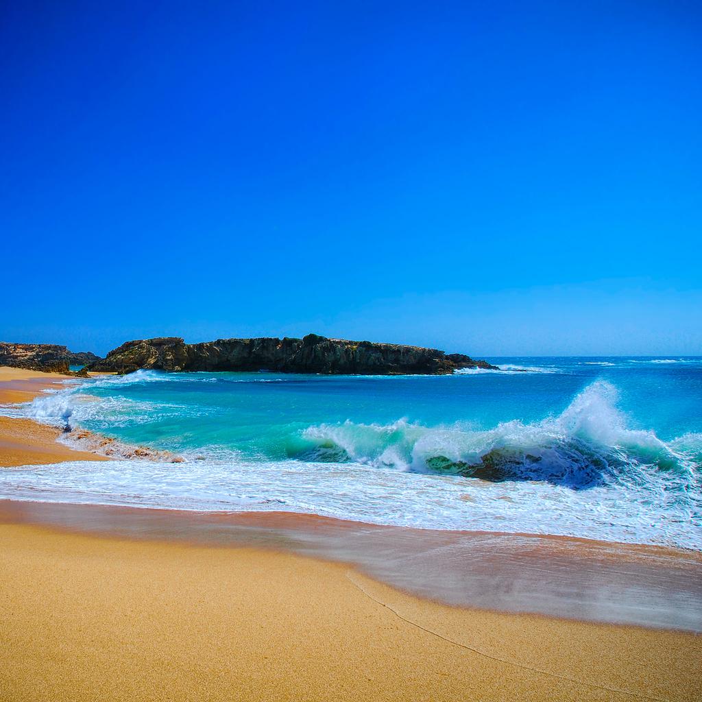 Soft and dense, this is Pacific ocean on white sand. Perspective is further back than most, providing a more gentle experience of an otherwise large set of waves that curl and roll along the wide beach. An airy fizz is often present, like a freshly poured glass of ice cold soda, but bigger. Waves are constant, but each one is unique and they are unpredictable in their rhythm. There is a steady, silent breeze.